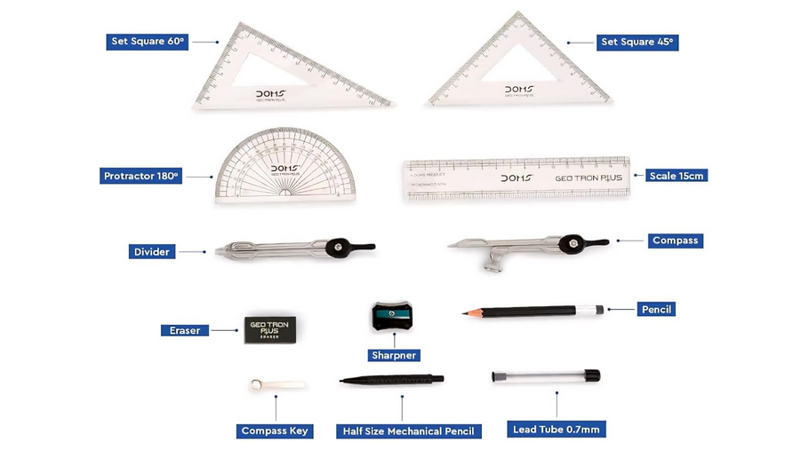 • 📏 Comprehensive Set: Includes essential tools such as a compass, divider, protractor, set squares, ruler, mechanical pencil & Lead Tube